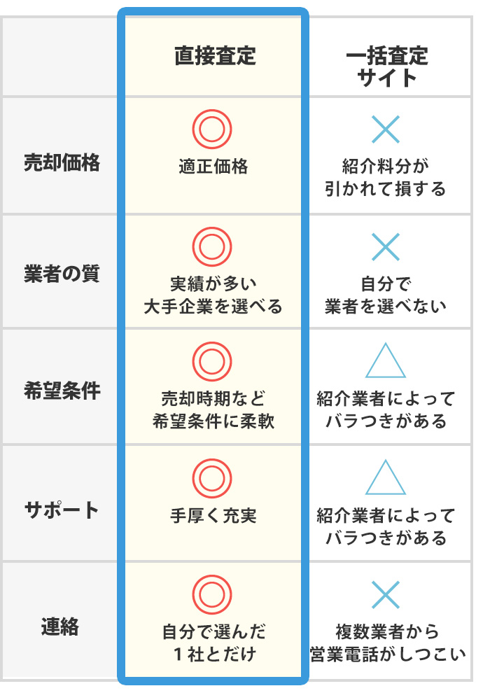 紹介料が引かれず売却価格に還元される、実績が多い大手企業を選べるのも、直接査定だからこそ!