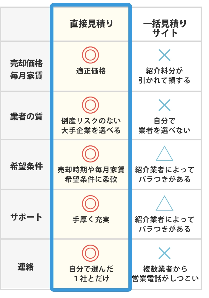 紹介料が引かれず売却価格や毎月家賃に還元される、倒産リスクがない大手企業を選べるのも、直接見積りだからこそ!